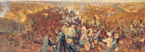 员工预备党员王志影讲述的是靳之林的油画作品《南泥湾》,描绘了在黄土群峦衬托下,八路军战士和当地百姓在南泥湾自力更生、艰苦奋斗的真实场景。他们战胜重重困难,一边生产、一边备战,用双手将荆棘遍布、荒无人烟的“烂泥湾”变成牛羊满川、麦浪起伏的“好江南”。从而带动了陕甘宁边区百业繁荣,为中国革命胜利奠定了坚实基础。