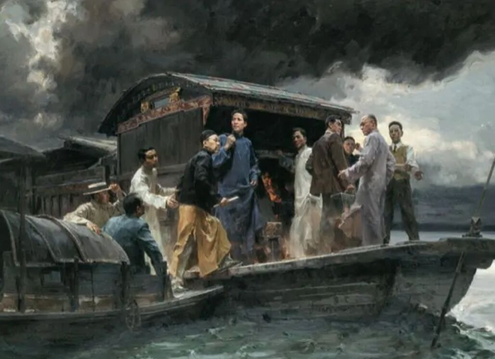 员工预备党员牟伟讲述的是何红舟,黄发祥的油画作品《启航中共一大会议》,再现了中共一大南湖会议的历史瞬间:毛泽东、董必武、何叔衡、张国焘、李达等13位一大代表正在登船。在画面中,毛泽东处于构图的中心,身着蓝色长衫,肩挎包袱,正站在船头回首眺望,显得意气风发。这种安排和描绘使他成为人物组群的视觉焦点。压顶的乌云意味着山雨欲来,也暗喻了当时黑暗的社会环境;而远处东方的曙光,又与游船上的中共一大代表们融为一体,暗喻了革命曙光的显现。黑暗与光亮,乌云的压迫力与代表们的坚强意志,形成了鲜明的对比,从而进一步表现出了革命的艰难和党的创建者们英勇无畏的精神。