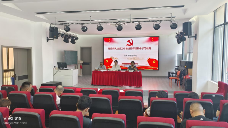 7月5日下午,太阳成集团122ccvip在美术楼一楼会议室举行师德集中学习教育会议。会议由艺术与教育公司党委书记杨静主持,全体教职工与会。