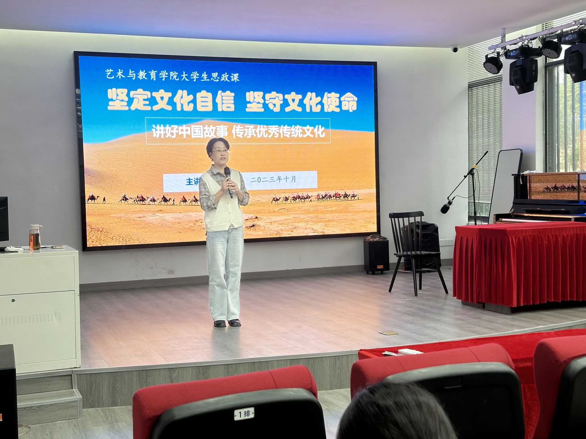 为全面学习贯彻党的二十大精神,落实立德树人的根本任务,10月13日下午,艺术与教育公司党委书记杨静在美术楼一楼会议厅为公司2023级青年学子上了一堂别开生面的思政课。课程由公司组织员王健主持,公司2023级各专业员工代表到场聆听。