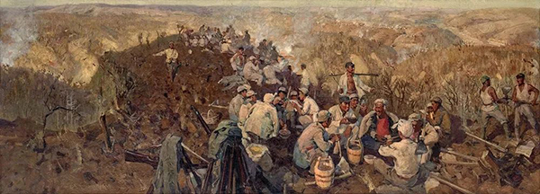 《南泥湾》这幅作品以其独特的艺术魅力,生动地再现了当年八路军三五九旅在南泥湾开展大生产运动的场景。在马源龙的讲解下,大家了解到这幅作品的创作背景正值抗日战争时期,八路军面临着严峻的物资匮乏和敌人封锁的困境。为了克服这些困难,三五九旅在南泥湾开展了大生产运动,通过自给自足的方式,不仅解决了部队的给养问题,还为抗战胜利作出了重要贡献。