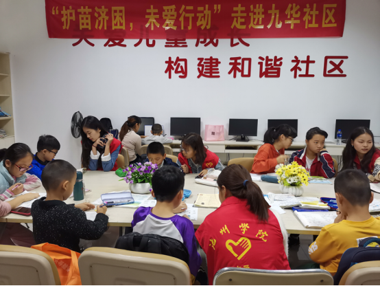 在开班仪式上,我院青协志愿服务队的志愿者们带领着小朋友们各种互动节目,教孩子们诵读了爱国诗词,教唱《我和我的祖国》;接下来根据社区困境儿童的特点,进行了团体心理游戏,以促进孩子们的交往和表达能力,提升他们的自信心以及对生活的热爱。