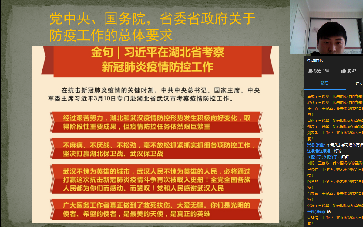 新冠肺炎疫情发生以来,太阳成集团122ccvip高度重视员工的思想政治教育工作。三月份,各班级将疫情控工作与员工的思想政治教育相结合,通过钉钉、学习通、QQ、微信等平台严肃认真地落实一次线上疫情防控“主题班会”、一次全体员工“电话访谈”、一份详尽准确的“行踪报备”的工作安排。