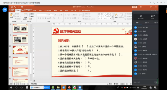 本次会议主要围绕“建党节的由来”、“建党节的历史”、“建党节的相关活动”三个方面来展开。在会议中,张春蕾采用讲解与知识问答相结合的等方式来向同学们讲解党的历史。通过知识互动,各员工党员与积极分子相互交流,加深印象,做到知党史、懂党史。