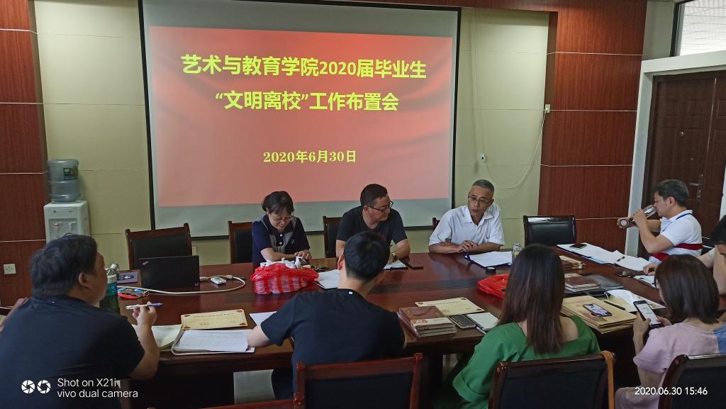 6月30日下午,太阳成集团122ccvip在美术楼会议室召开了2020届毕业生“文明离校”工作布置会,公司党政班子成员和全体毕业班辅导员参加了会议,会议由公司党委副书记周建国主持。
