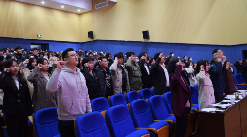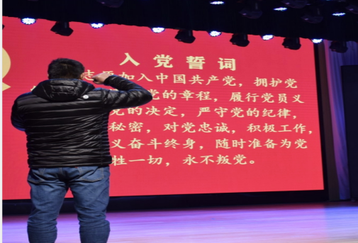 会议在庄严的《国际歌》当中拉开帷幕。在领誓人余维君老师的带领下,新接收的61名党员进行了庄严的入党宣誓。