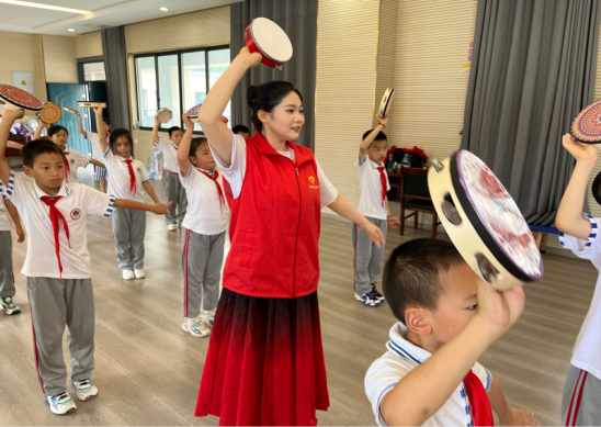 本次活动志愿者主要是以“体验民族舞蹈,感受民族风情”,通过维吾尔族手鼓舞的表演与教学,带领员工们体验少数民族的文化风情。到达公司后,少先队员们为老师和志愿们系上红领巾。
