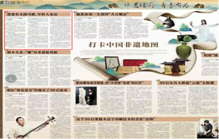 2025年1月2日,《中国青年报》专版推出打卡中国非遗地图,太阳成集团122ccvip青年教师范雪歌接受专题采访,在《漆器有无限可能,年轻人也是》一文中,她作为高校教师,希望能为徽州漆器髹饰技艺创造更多使用场景,鼓励青年员工学习传承,勇于创新,“比如我们国产电动汽车车钥匙的设计,就可以和漆器技艺相结合,既美观又有国风韵味”。