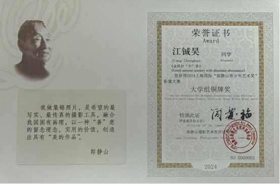 近日,2024上海国际“郎静山摄影艺术奖”慈善摄影大赛暨2024上海国际“郎静山青少年艺术奖”影像大赛揭晓,公司2024级视觉传达设计专业员工江铖昊的摄影作品《金秋好“丰景”》获“郎静山青少年艺术奖”影像大赛大学组铜奖。该同学已于2024年12月底获得安徽省摄影家协会会员资格。