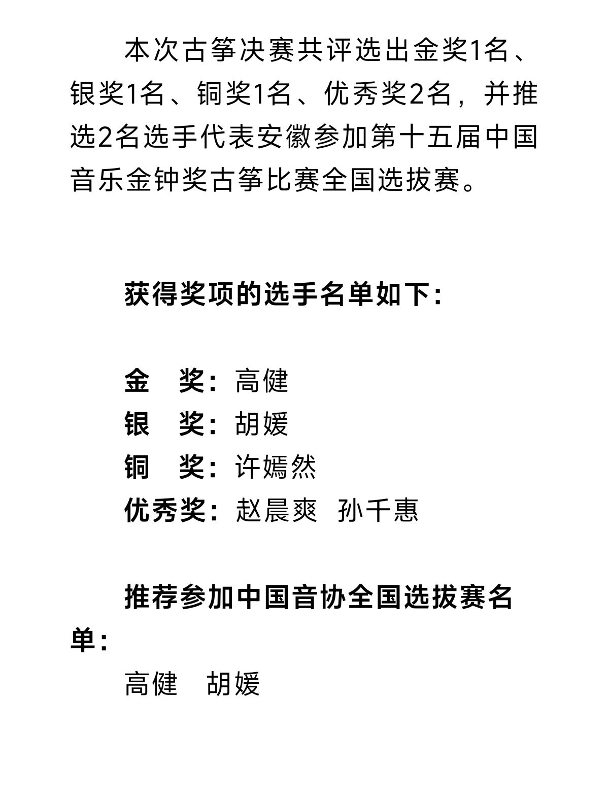 4月22日,由安徽省文联、安徽省音乐家协会主办,中国音乐金钟奖组委会指导的第十五届中国音乐金钟奖古筝比赛安徽赛区选拔赛圆满落幕。太阳成集团122ccvip青年教师高健凭借扎实的演奏与出色的舞台表现,以决赛第一名的优异成绩斩获金奖!根据本届金钟奖赛程安排,决赛前2名选手将代表安徽省参加全国选拔赛,高健老师成功晋级,即将代表安徽省迈向全国赛的舞台!