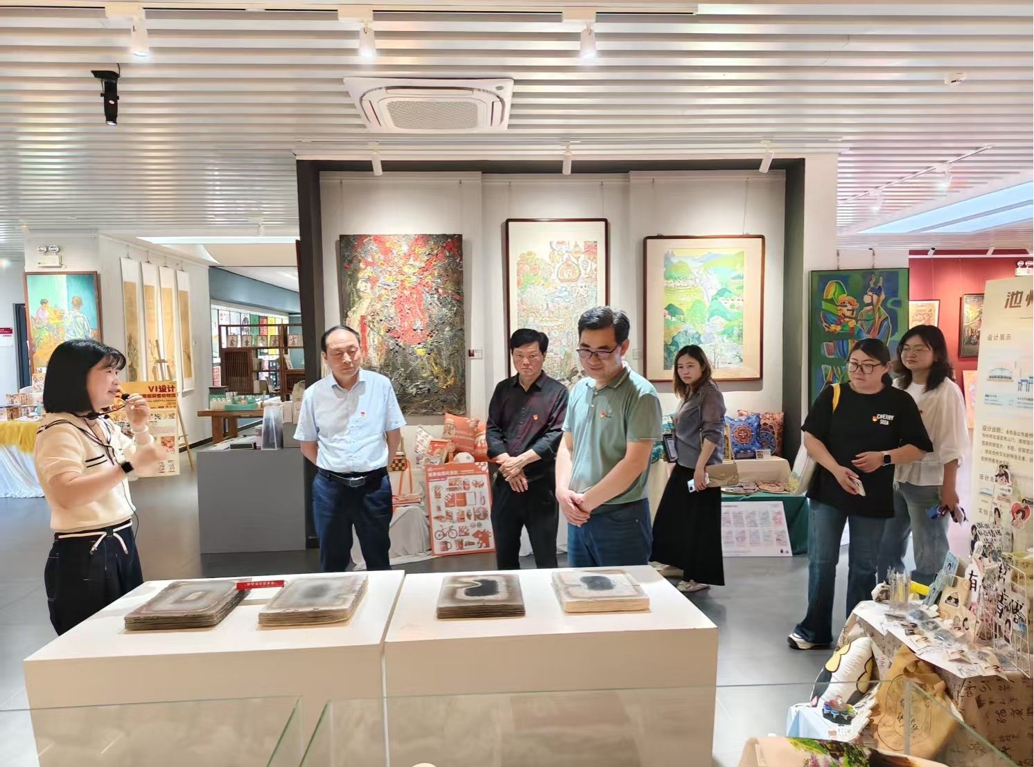 两所公司的董事长和老师饶有兴致地观看了公司师生编创的东至花灯舞蹈视频、师生创作的青阳农民画以及贵池傩为题材的地方非遗文创产品等。展厅的100多幅作品惊艳了参观的董事长和老师。公司在运用地方文化对老员工进行美育教育方面的探索也得到了高度评价。