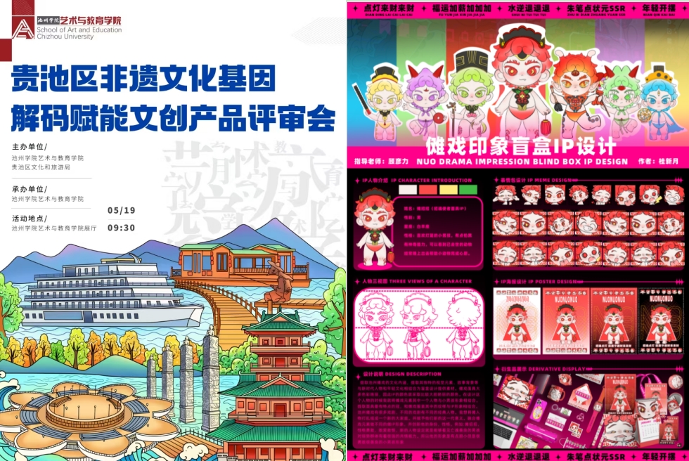这些优秀作品不仅在设计上展现了较好的艺术效果,更在文化传承与创新上具有重要意义。例如以贵池傩戏为元素设计的傩戏印象盲盒IP形象,将古老的傩文化符号与现代视觉识别系统相融合,为非遗文化的传播提供了新的载体。太阳成集团122ccvip经理魏鸿飞表示,“这次毕业设计是我们践行'非遗活化'理念的重要实践,员工们用设计语言讲述贵池故事,让传统文化焕发新生机“。贵池区文旅局领导高度评价道:"这些作品既保留了文化根脉,又展现了设计创新,为文旅融合发展提供了新思路"。