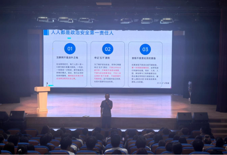 李俊明以《青春启航:新生安全生存指南》为题开展专题教育,将意识形态安全与政治安全作为核心重点,从六个维度为新生筑牢安全防线。在政治与意识形态安全部分,他强调要坚持思想引领,严守网络底线,牢记行为准则,警惕风险陷阱。李俊明特别指出,安全是成长的前提,而意识形态安全是安全体系的“压舱石”。新生若在思想认知、政治辨别上遇到困惑,要第一时间向辅导员和公司党组织寻求帮助,确保始终在正确的方向上前行。