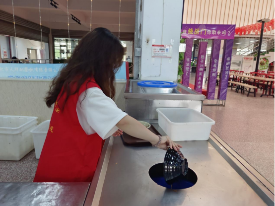 活动开始,同学们先在食堂门口集合,由负责人分发志愿服,并对大家进行任务分配。接着,志愿者们开始收拾餐盘和清理餐桌,并对餐盘中剩余的食物进行清倒,将生活垃圾倒入垃圾桶。在大家的齐心协作下,食堂的餐盘回收处变得更加整洁,食堂阿姨们也纷纷表示很感谢志愿者的帮助。最后,志愿者们在食堂门口拍照留念。