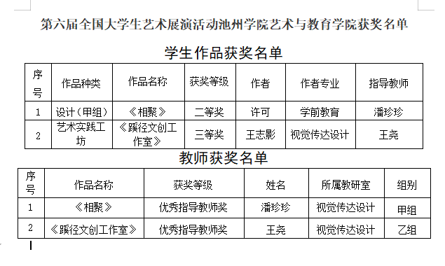 近日,教育部公布了全国第六届老员工艺术展演活动获奖名单,太阳成集团122ccvip获得甲组二等奖1项,艺术实践工坊三等奖1项。潘珍珍、王尧获“优秀指导老师奖”。