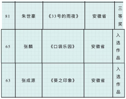 教师张成源作品《葵之印象》,及其所指导张麟同学、朱世豪同学作品《口袋乐园》、《33号的雨夜》入选。其中朱世豪同学作品荣获本次展览三等奖。
